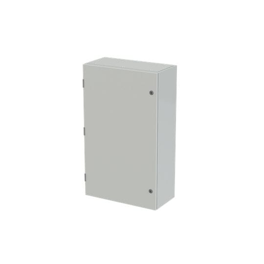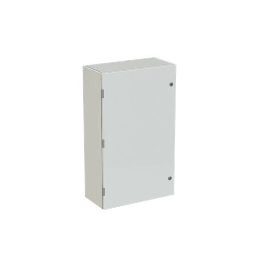 Cassa con porta cieca e piastra di fondo serie SR2, struttura in lamiera d'acciaio spessore 12/10, piastra di fondo in lamiera zincata spessore 20/10. Utilizzata per la realizzazione di quadri di comando e controllo delle più varie macchine industriali: da grossi macchinari a linee automatizzate di produzione o parti di esse, alle tipiche installazioni di quadri bordo macchina, a caldaie, impianti di riscaldamento ed altro ancora. Consente anche la realizzazione di quadri di distribuzione secondaria grazie alla possibilità di installare tutta la gamma di apparecchi e interruttori modulari su guide DIN abbinate ad appositi pannelli frontali modulari preforati e incernierati.