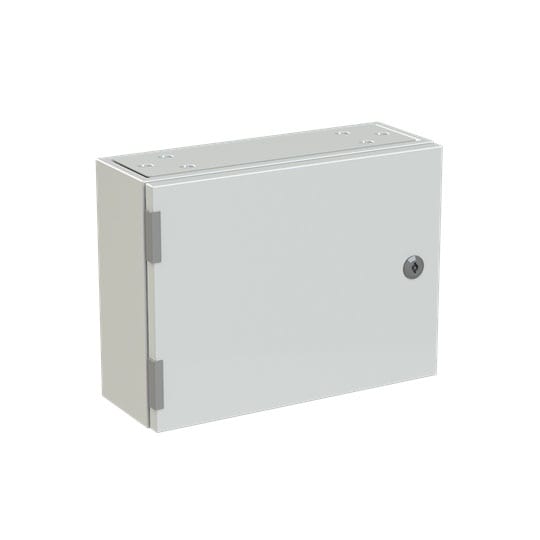 Cassa con porta cieca e piastra di fondo serie SR2, struttura in lamiera d'acciaio spessore 12/10, piastra di fondo in lamiera zincata spessore 20/10. Utilizzata per la realizzazione di quadri di comando e controllo delle più varie macchine industriali: da grossi macchinari a linee automatizzate di produzione o parti di esse, alle tipiche installazioni di quadri bordo macchina, a caldaie, impianti di riscaldamento ed altro ancora. Consente anche la realizzazione di quadri di distribuzione secondaria grazie alla possibilità di installare tutta la gamma di apparecchi e interruttori modulari su guide DIN abbinate ad appositi pannelli frontali modulari preforati e incernierati.
