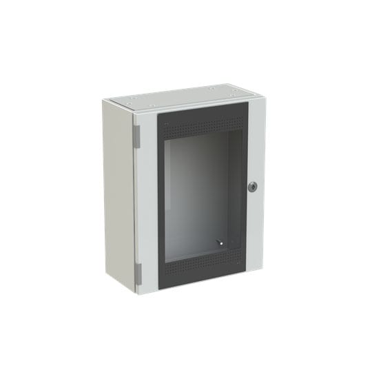 Cassa con porta in vetro senza piastra di fondo serie SR2, struttura in lamiera d'acciaio spessore 12/10. Utilizzata per la realizzazione di quadri di comando e controllo delle più varie macchine industriali: da grossi macchinari a linee automatizzate diproduzione o parti di esse, alle tipiche installazioni di quadri bordo macchina, a caldaie, impianti di riscaldamento ed altro ancora.