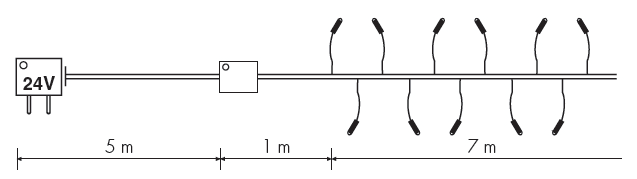 Ghirlanda lineare con 120 led ultra luminosi e con gioco luci, per uso all’esterno ed all’interno.Costruita secondo la norma EN60598-2-20-A2:2004. Gioco luci elettronico stagno 8 effetti. Trasformatore Plug-in IP 44 . Cavo 26AWG autoestinguente, trasparente. I led ultra luminosi consentono: Bassissimi consumi. Alta luminosità. Durata lunghissima. Nessun riscaldamento e quindi grande risparmio energetico. Lunghezza totale: 13m. 120 led Ø 3mm