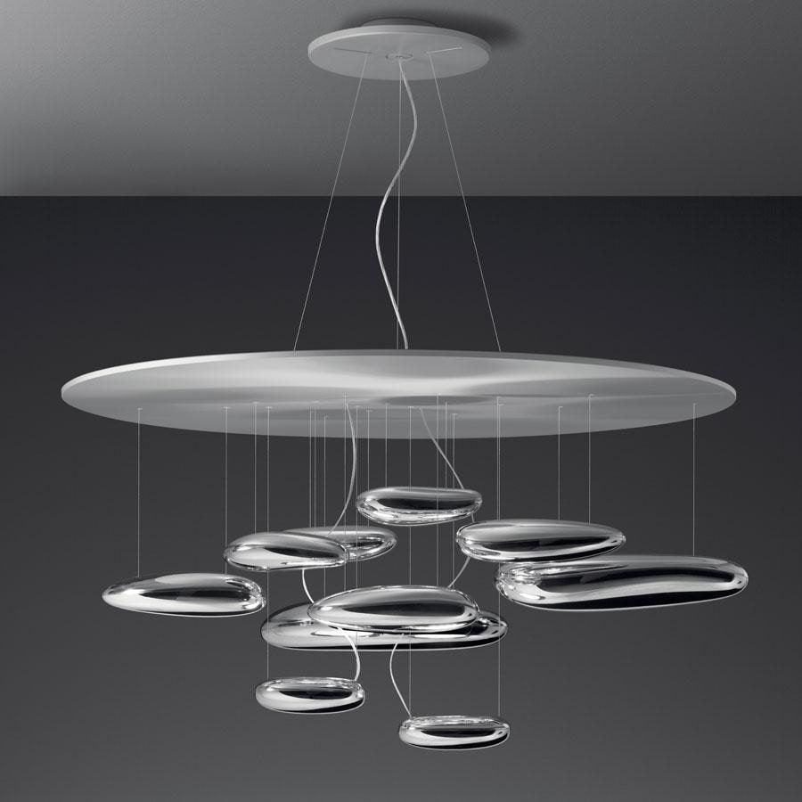 Mercury LED 70W 4576lm 3000K sospensione - Inox. DESIGN BY: Ross Lovegrove 2007. Una lampada che consiste in una serie di grandi ciotoli fluttuanti sotto un disco di alluminio semplice e moderno. A loro volta, i ciotoli si riflettono l’un l’altro, facendo rimbalzare la luce tra le loro lisce superfici biomorfiche. Durante il giorno l’oggetto è una scultura che riflette le dinamiche della luce naturale e il movimento delle persone attorno a sé. Corpi luminosi in alluminio pressofuso; corpi riflettenti in materiale termoplastico stampato ad iniezione con finitura metallizzata; riflettore in alluminio stampato. La forma modulare si presta alla componibilità e alla realizzazione di combinazioni personalizzate, fornite come progetto speciale.