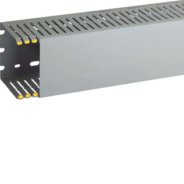 Canalette in PVC autoestinguente per il cablaggio di quadri elettrici, progettate per un’organizzazione efficiente e sicura dei cavi. Dotate di coestruso morbido giallo sulle lamelle, misurano b80 x h80 mm con modulo 10 mm (feritoria 4 mm, lamella 6 mm).Conformi alla norma UL94 V0 e resistenti al filo incandescente fino a 960 °C (GWT EN 60695-2-11). Colore grigio RAL 7030, lunghezza 2 m, complete di coperchio.
