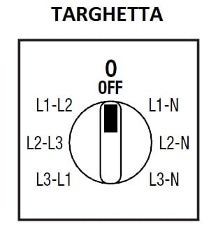 Commutatore voltmetrico tre tensioni concatenate + tre tensioni di fase, montaggio retroquadro con viti, mostrina grigia 48x48mm, manopola nera, IP65