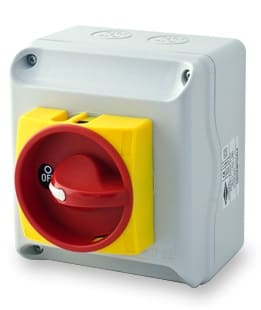 Cassetta in ABS IP65 con comando frontale e blocco coperchio in on. Mostrina gialla 67x67mm, manopola rossa lucchettabile (max 3 lucchetti)