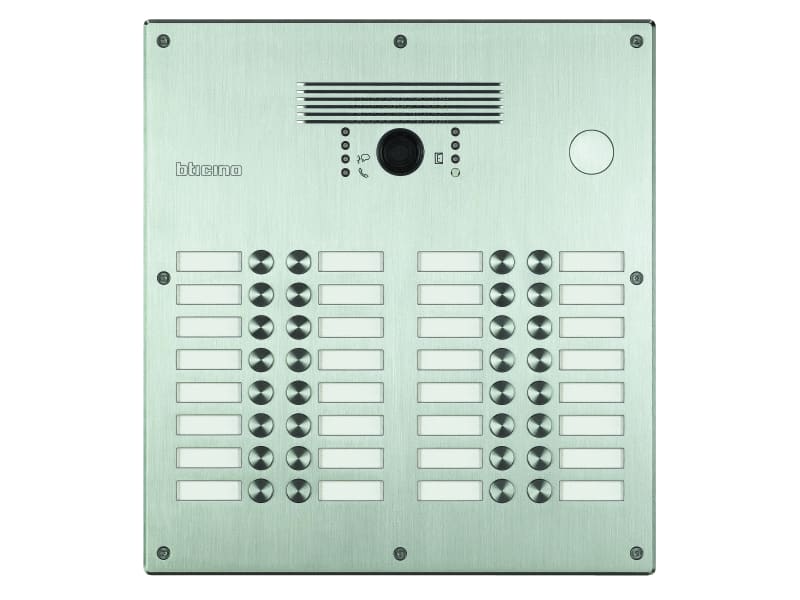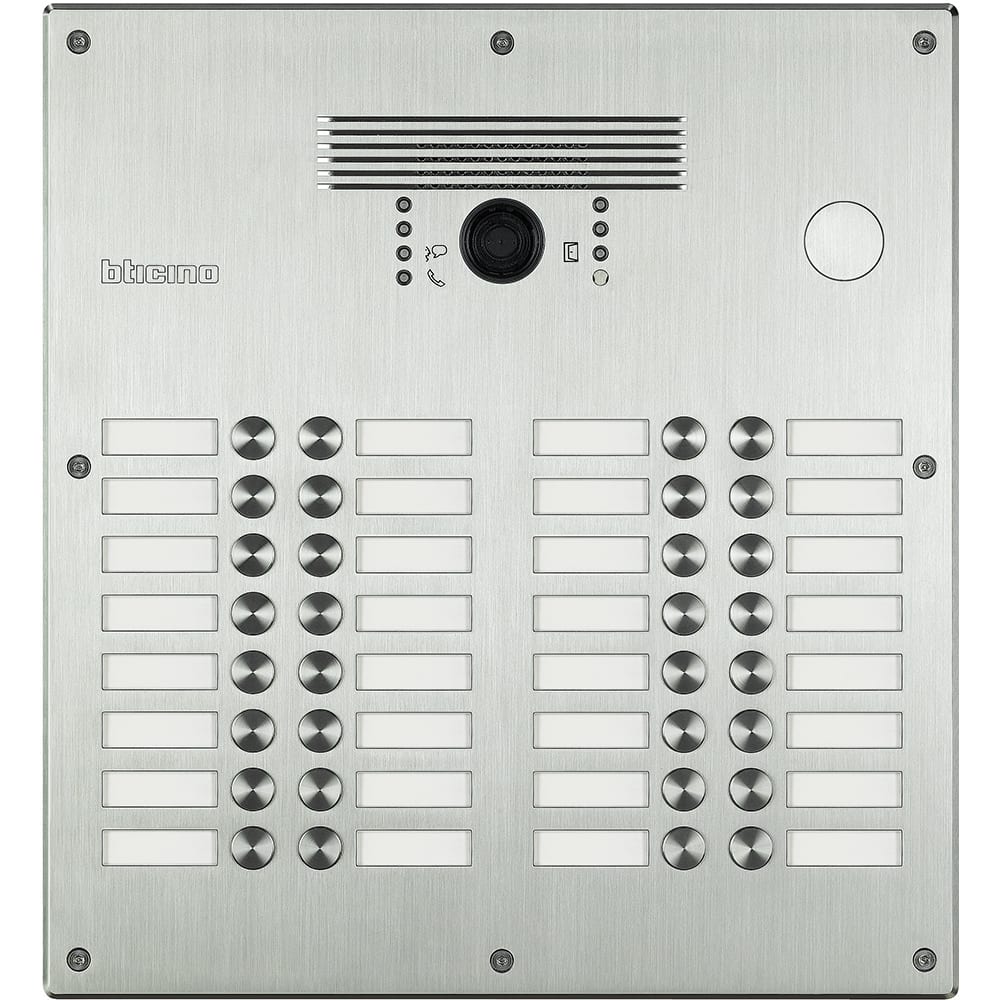 Pulsantiera Linea 300 video. Tecnologia 2 fili, antivandalica monoblocco fino a 32 chiamate in finitura acciaio Inox. Comprensiva di : scatola da incasso,telaio,modulo fonico audio video a colori e modulo/i pulsanti precablati. Predisposizione per il montaggio frontale di un interruttore a chiave. Tasti di chiamata retroilluminati. Indicazioni visive e sonore per: chiamata in corso,sistema occupato,stato serratura. Viti antieffrazione. Permette l’attivazione di una elettroserratura collegata direttamente tra i morsetti S+ e S- (18 V 4 A impulsivi, 250 mA di mantenimento, 30 Ohm max).