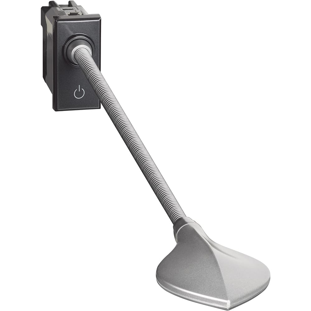 lampada da lettura dimmerabile - si installa alla testa del letto permettendo di disporre di una illuminazione direzionale. E\' dotata di un braccio flessibile (lungh. 31 cm) che permette di orientarne l\'estremità illuminante. L\'intensità luminosa è dimmerabile mediante la pressione prolungata del comando di accensione/spegnimento integrato. Può anche essere collegata ad un comando remoto e se necessario, è possibile disabilitare il comando integrato con una pressione di 30 sec. - Lampada LED - Consumo3W - Flusso luminoso 110 lumen (equivalente a 15W ad incandescenza) - Durata 40.000 ore - 1 modulo (da incasso) - Antracite