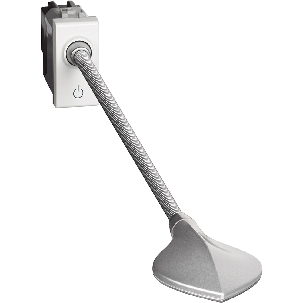 lampada da lettura dimmerabile - si installa alla testa del letto permettendo di disporre di una illuminazione direzionale. E\' dotata di un braccio flessibile (lungh. 31 cm) che permette di orientarne l\'estremità illuminante. L\'intensità luminosa è dimmerabile mediante la pressione prolungata del comando di accensione/spegnimento integrato. Può anche essere collegata ad un comando remoto e se necessario, è possibile disabilitare il comando integrato con una pressione di 30 sec. - Lampada LED - Consumo3W - Flusso luminoso 110 lumen (equivalente a 15W ad incandescenza) - Durata 40.000 ore - 1 modulo (da incasso) - Bianco