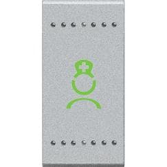 Annullo chiamata WC. Pulsante NC con icona infermiera di colore verde, da installare nel bagno annesso alla camera del paziente. Deve essere collegato al terminale di camera. Consente al personale di chiudere una chiamata bagno, nel rispetto delle norme VDE. Dispositivo 1 modulo - serie civile