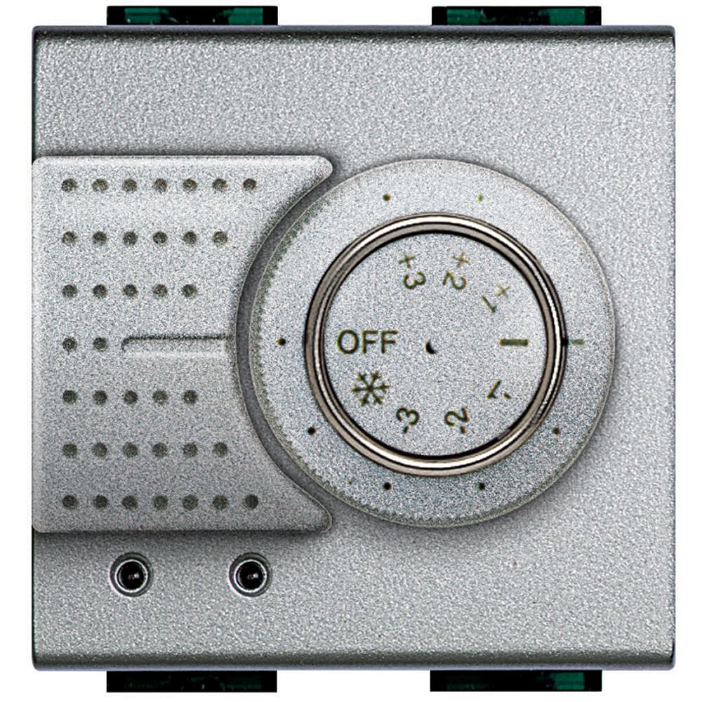 Sonda Livinglight per il controllo della temperatura ambiente per impianti di riscaldamento e raffrescamento. Dotato di manopola per la variazione di ± 3 °C rispetto alla temperatura impostata nella centrale e per la selezione delle modalità OFF e antigelo - 2 moduli.