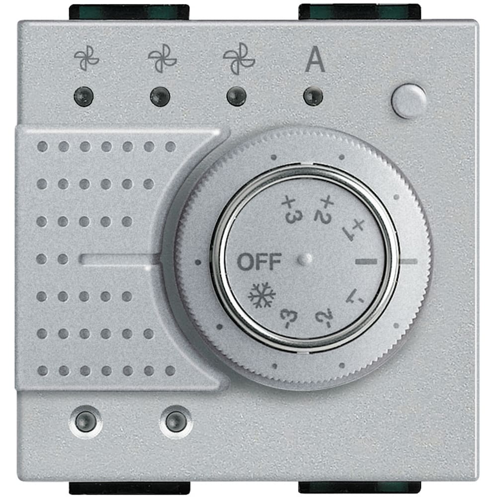 Sonda Livinglight per il controllo della temperatura ambiente per impianti di riscaldamento e raffrescamento. Dotato di manopola per la variazione di ± 3°C rispetto alla temperatura impostata nella centrale e per la selezione delle modalità OFF e antigelo con selezione della velocità manuale/automatica per fan-coil e sistema Idrorelax - 2 moduli.