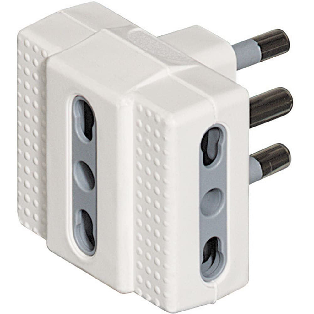 Adattatore TRIS con 3 prese bipasso 10/16A e spina 16A bianco. Venduto in blister 90x122 mm (LxA)