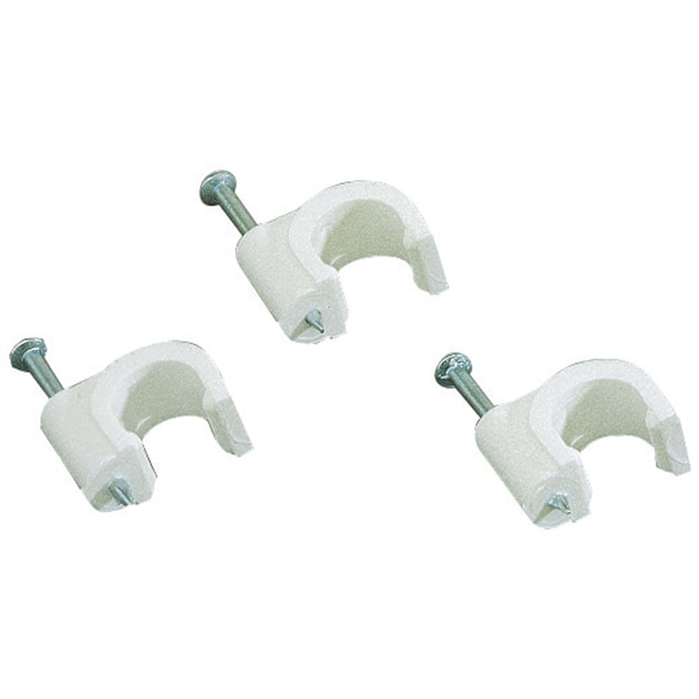 confezione con 30 graffette in plastica con chiodo in acciaio per fissaggio a parete di cavi tondi diametro 9 mm - prodotto in blister 72x122mm. Formato blister: blister 72x122