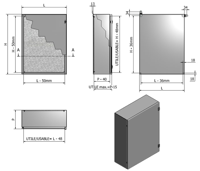 Cassetta composta da corpo, porta esterna cieca, piastra interna fissata sul fondo. • Corpo in acciaio inox AISI304 satinato scotch brite sp.12/10 pressopiegato e saldato • Porta in acciaio inox AISI 304 satinato scotch brite sp. 12/10 • Piastra interna in lamiera sp. 15-20/10 sendzimir • Guarnizioni, poliuretaniche applicate in colata continua • Cerniere reversibili con apertura 110° • Serratura con impronta doppia aletta • Grado di protezione IP 66 - TYPE 4X