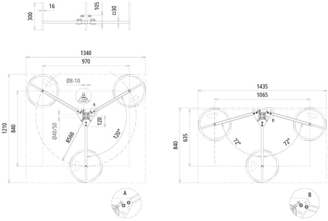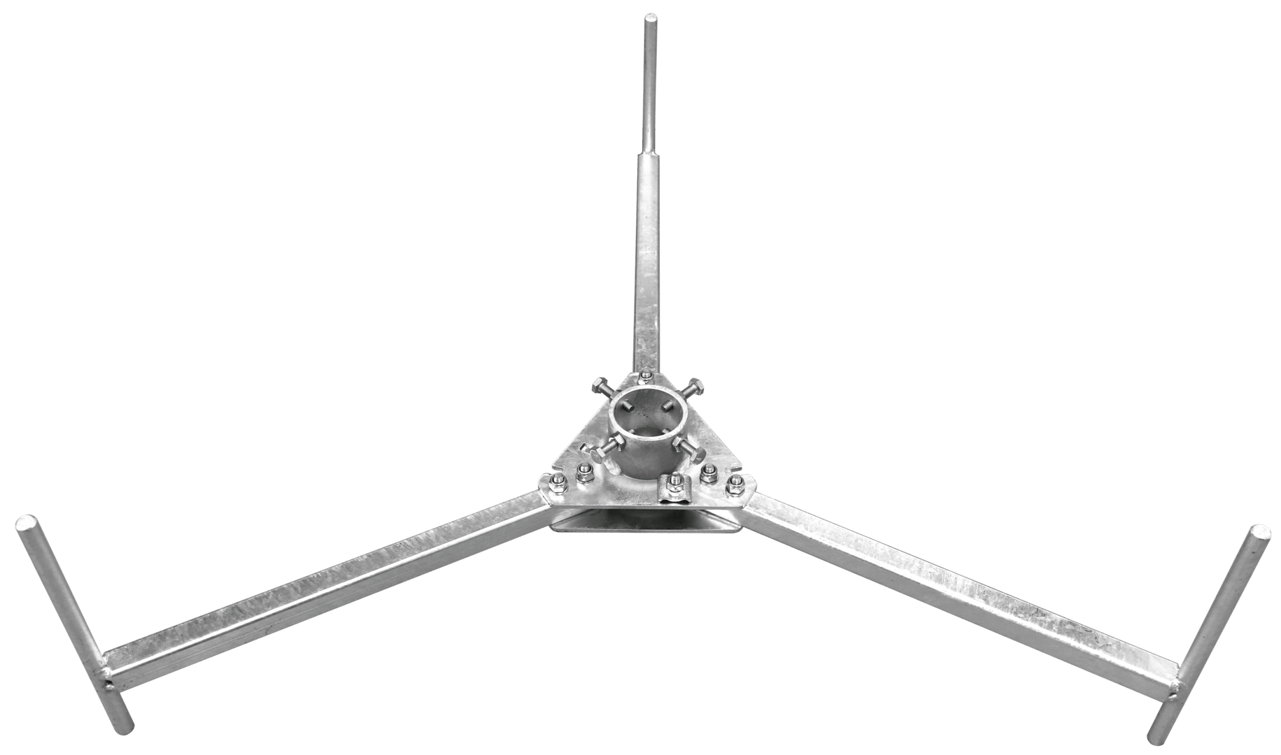 Tripode per l'installazione indipendente di tubi portanti DEHNiso-Combi (D50, lunghezza 3200 mm) oppure aste di captazione D40 con lunghezza 3000 mm. Per il montaggio tramite zoccoli in cemento con tecnica a cuneo. senza ulteriore fissaggio ad elementi della costruzione. Adattabile all'inclinazione del tetto fino a max 10°. Esecuzione ripiegabile per il trasporto.