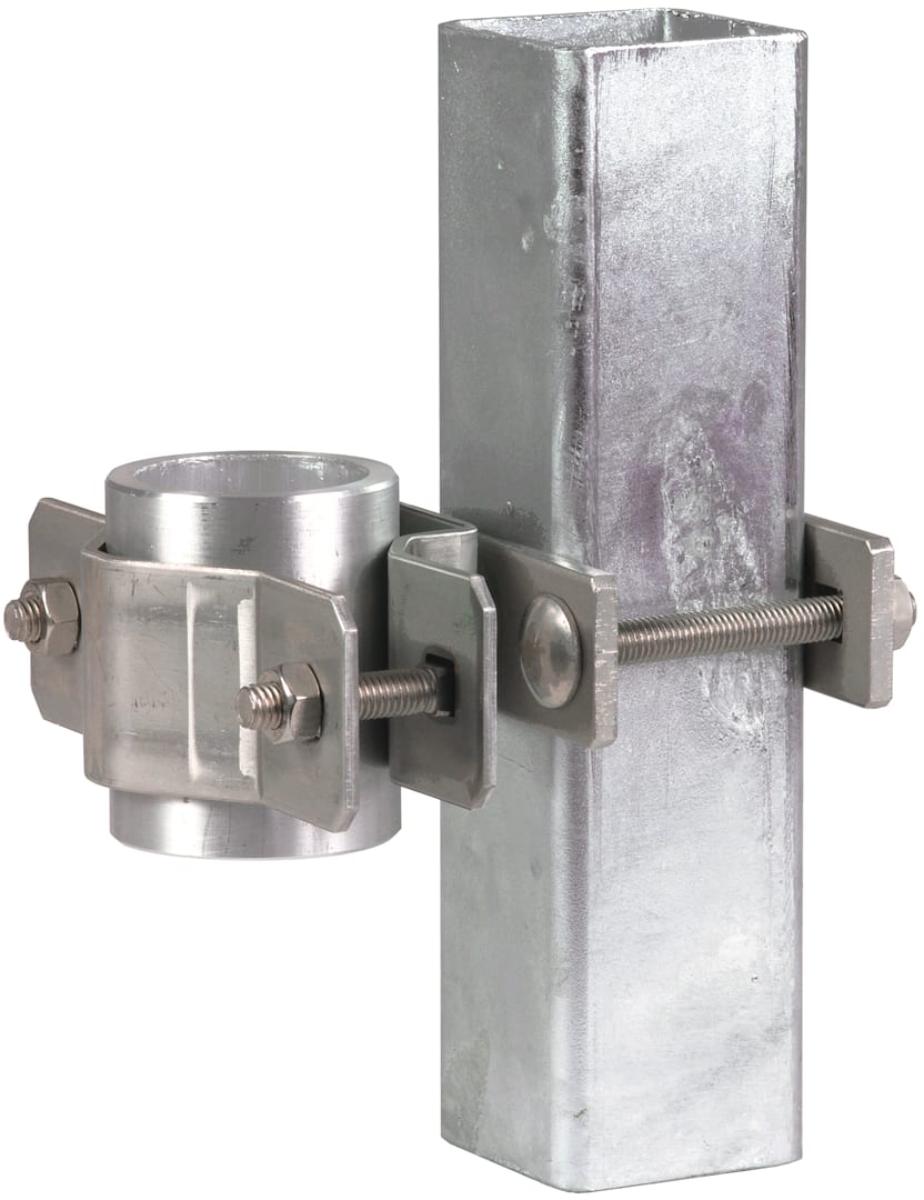 Fissaggio per ringhiere, per il montaggio di tubi portanti (D50 mm) oppure aste di captazione (D 40 mm), p. es. su profilati quadrati cavi.