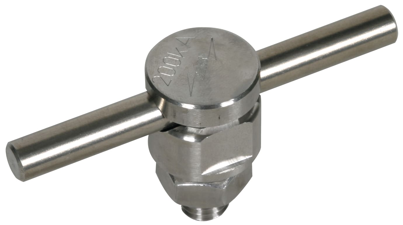 Connettore morsetto-vite per la connessione di conduttori tondi su profili piatti. Portata di corrente di fulmine provata fino a 200 kA (10/350 µs) in appoggio a CEI EN 62561-1. Esecuzione componibile in acciaio INOX con vite, grova e dado M10.