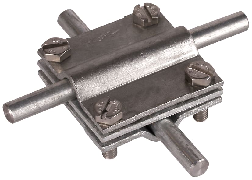 Morsetto a croce secondo CEI EN 62561-1 per collegamenti fuori terra di conduttori tondi e piatti disposti a croce e a "T". Esecuzione con piastra intermedia e viti M6.