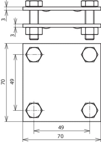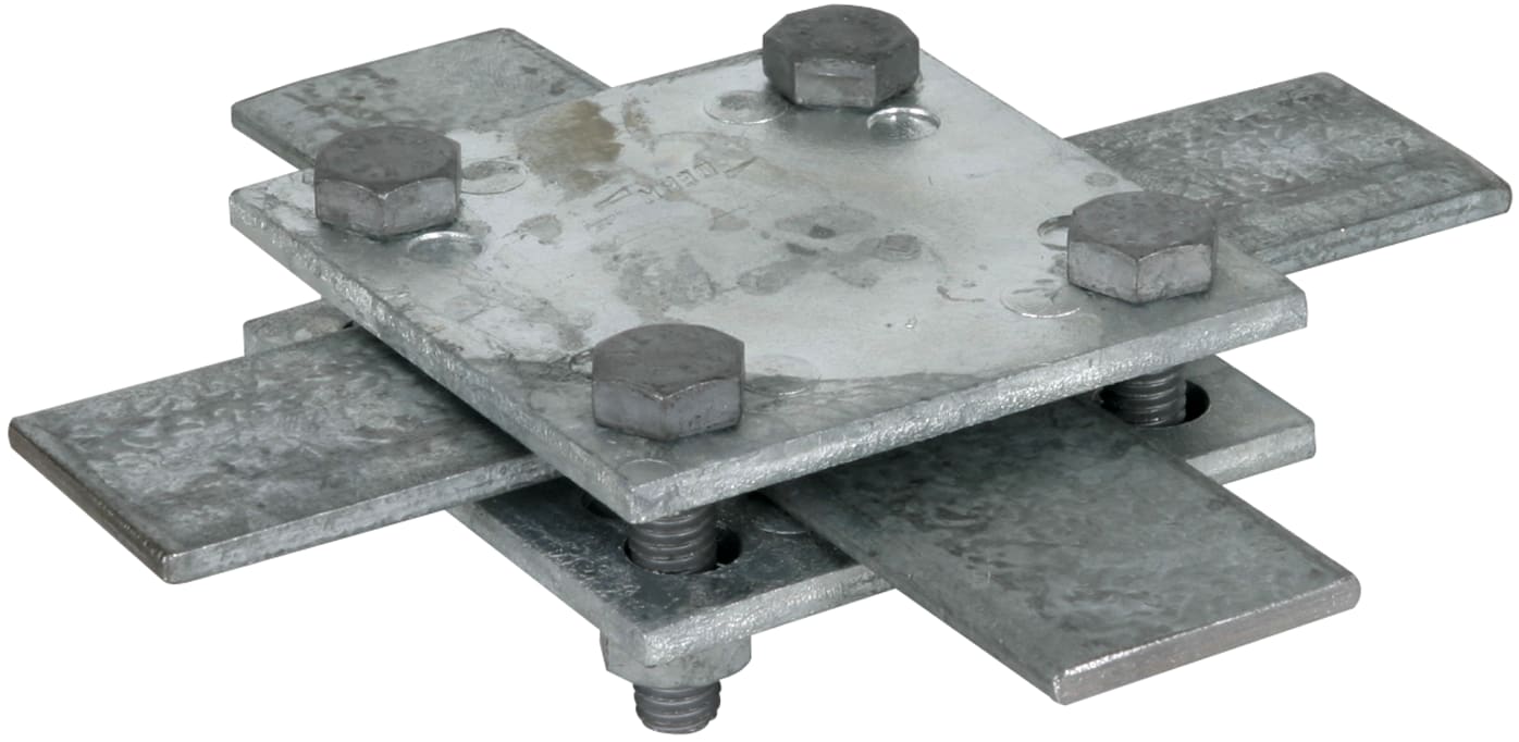 Morsetto a croce secondo CEI EN 62561-1 per collegamenti fuori e sotto terra di due conduttori piatti (larghezza fino a 40 mm). Esecuzione con piastra intermedia e viti M8.
