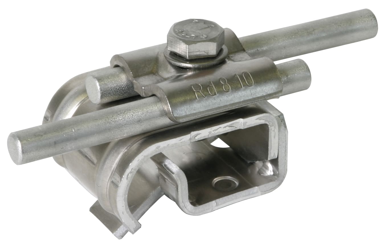 Morsetto per grondaia secondo CEI EN 62561-1, per il collegamento di conduttori tondi al bordo della grondaia. Esecuzione con cavallotto di fissaggio, posa del conduttore longitudinale o trasversale.