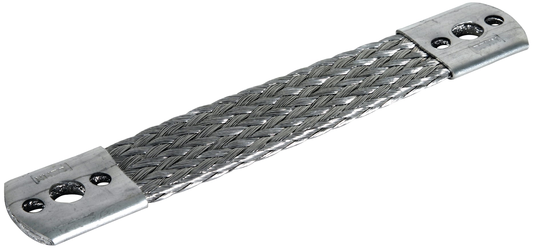 Treccia di ponticellamento secondo CEI EN 62561-1 per il collegamento di rivestimenti metallici per mezzo di rivetti e viti. Esecuzione corta, per il fissaggio con viti autofilettanti.