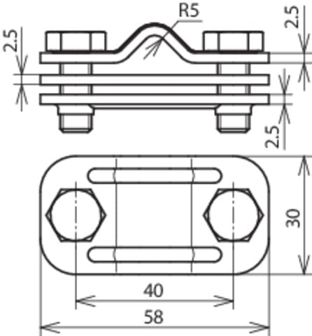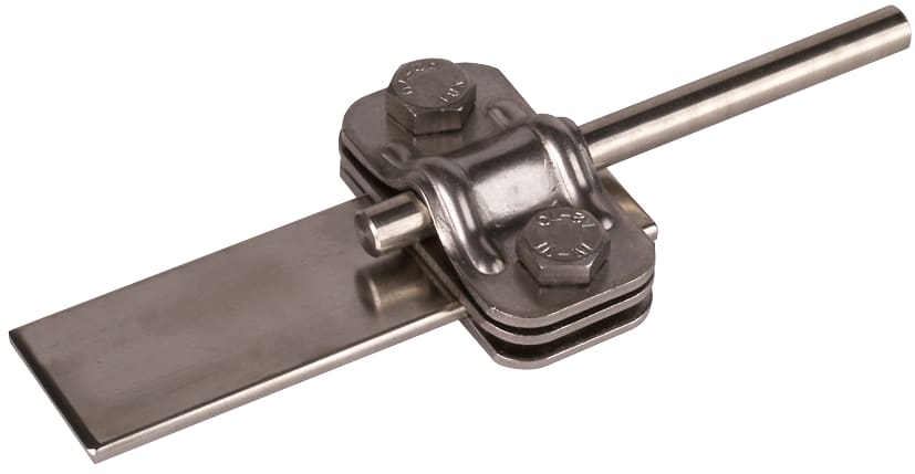 Morsetto di sezionamento UNI secondo CEI EN 62561-1 per il collegamento della calata con l’adduzione a terra. Esecuzione con piastra intermedia per conduttori tondi e piatti.