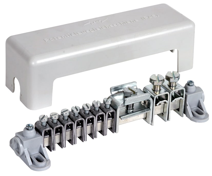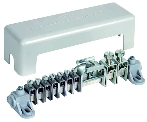 Barra equipotenziale secondo CEI EN 62561-1 per l'equipotenzialità di sicurezza e funzione secondo CEI 64-8 (DIN VDE 0100-410/540) (barra di terra principale) e l'equipotenzialità antifulmine secondo CEI EN 62305-3 (CEI 81-10/3). Esecuzione A, provata secondo DIN VDE 0609, morsetti componibili in Fe/gal Zn, supporto per barra e coperchio in materiale plastico, grigio (privo di alogeni), coperchio piombabile e scrivibile.