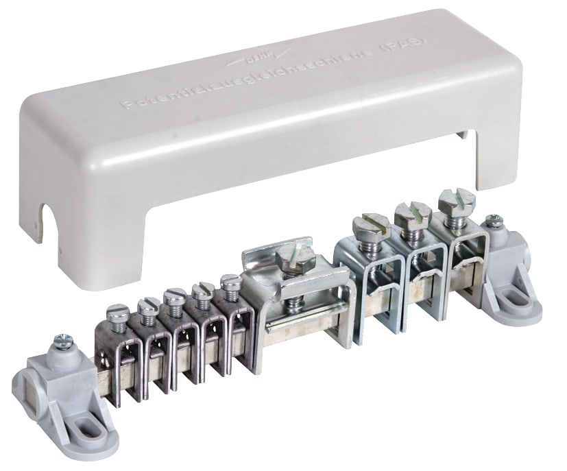 Barra equipotenziale secondo CEI EN 62561-1 per l'equipotenzialità di sicurezza e funzione secondo CEI 64-8 (DIN VDE 0100-410/540) (barra di messa a terra principale) e l'equipotenzialità antifulmine secondo CEI EN 62305-3 (CEI 81-10/3). Esecuzione B, provata secondo DIN VDE 0609, morsetti componibili in Fe/gal Zn, supporto per barra e coperchio in materiale plastico, grigio (privo di alogeni), coperchio piombabile e scrivibile.