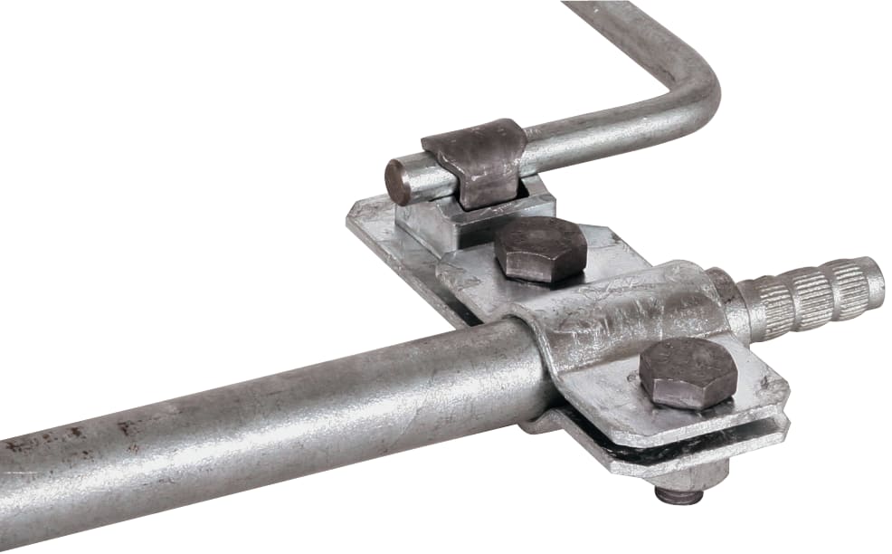 Collare di collegamento secondo CEI EN 62561-1 per la connessione di conduttori tondi su dispersori di profondità. Esecuzione con connettore KS (Td 7-10 mm) su un lato.