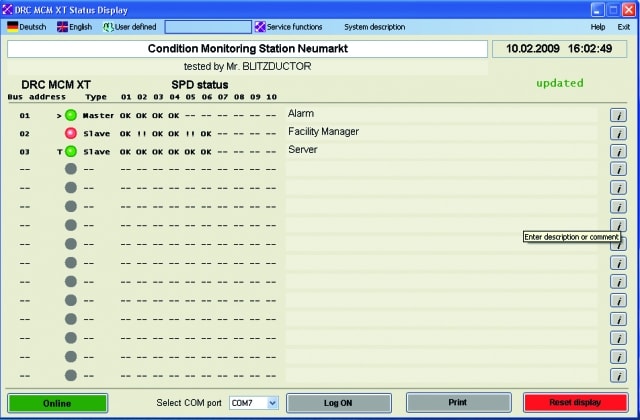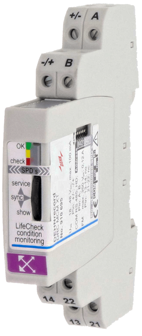 Apparecchio modulare con sensore LifeCheck integrato, per il controllo di stato fino a max 10 BLITZDUCTOR XT/XTU con LifeCheck. Indicazione di stato ottica, LED a 3 colori, degli scaricatori, combinata con segnalazione a distanza (FM) (contatto in apertura oppure in chiusura). In alternativa può essere utilizzato, con l'ausilio del convertitore d'interfaccia RS 485, il software gratuito "Status Display e Service Console". Con il software è possibile visualizzare in forma protetta su PC lo stato di tutti gli scaricatori monitorati. Download: www.dehn.de/download