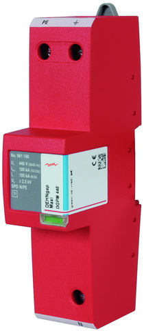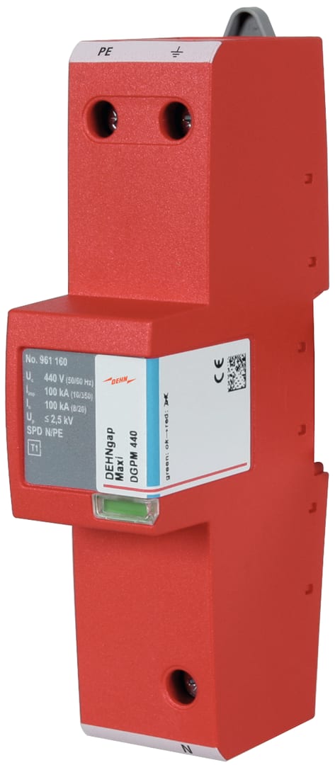 Scaricatore coordinato per corrente di fulmine N-PE, unipolare, DEHNgap modular, SPD a spinterometro Tipo 1 secondo EN 61643-11. Scaricatore di corrente sommatoria, specialmente adatto per l'impiego nella rete TT nel circuito "3+1"e "1+1", secondo CEI CLC/TS 61643-12 (IEC 60364-5-534) e la variante V2 della CEI 64-8, tra il conduttore neutro N ed il conduttore di protezione PE, per UC = 440 V. Per la protezione di impianti elettrici utilizzatori in bassa tensione, anche in caso di fulminazione diretta. Per l'impiego nel concetto di protezione da fulminazione a zone, ai passaggi 0A – 1, nel circuito "3+1".
