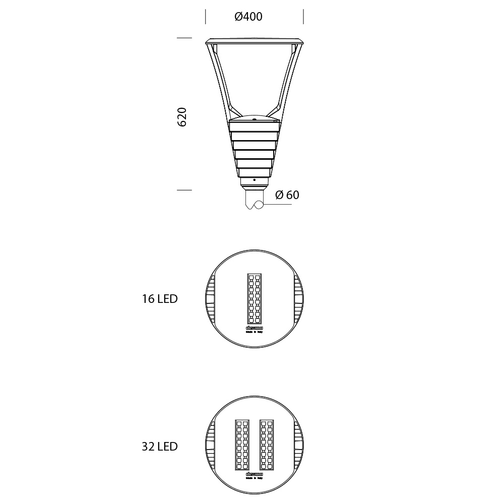 3350 Garda 1 - Rotosimmetrico - Corpo e bracci : in alluminio pressofuso, disegnati con una sezione a bassissima superficie di esposizione al vento. Ottiche: ottiche realizzate in PMMA con alta resistenza alla temperatura e ai raggi UV. Attacco palo: inalluminio pressofuso. Idoneo per pali di diametro da 60 a 76mm. Diffusore: vetro trasparente sp. 4mm temperato resistente agli shock termici e agli urti (UNI-EN 12150-1 : 2001). Verniciatura: iil ciclo di verniciatura standard a liquido, ad immersione, ècomposto da diverse fasi. Una prima fase di pretrattamento superficiale del metallo, poi una verniciatura in cataforesi epossidica resistente alla corrosione e alle nebbie saline, poi una mano finale a liquido bicomponente acrilico, stabilizzato ai raggiUV. Dotazione: cablaggio posto su piastra di cablaggio in nylon 30% f.v. con connettori rapidi per il collegamento della linea e del LED. Dispositivo di controllo della temperatura all’interno dell’apparecchio con rispristino automatico. Con dispositivoelettronico dedicato alla protezione del modulo LED. Valvola anticondensa per il ricircolo dell’aria. Risparmio: la possibilità di scegliere la corrente di pilotaggio dei LED consente di disporre sempre della potenza adeguata ad una specifica condizione progettuale, semplificando anche l’approccio alle future problematiche di manutenzione ad aggiornamento. La scelta di una corrente più bassa aumenterà l’efficienza e quindi migliorerà il risparmio energetico, mentre con una corrente maggiore si otterrà più luce e sarà possibile ridurre il numero degli apparecchi. Normativa: prodotti in conformità alle norme EN60598 - CEI 34 - 21. Hanno grado di protezione secondo le norme EN60529. LED: fattore di potenza: >= 0,9. Mantenimento del flusso luminoso al 80%: 80.000h (L80B10). Superficie di esposizione al vento: 769 cmq. LED 67W 5966lm 700mA 3000K CRI 70. Antracite.