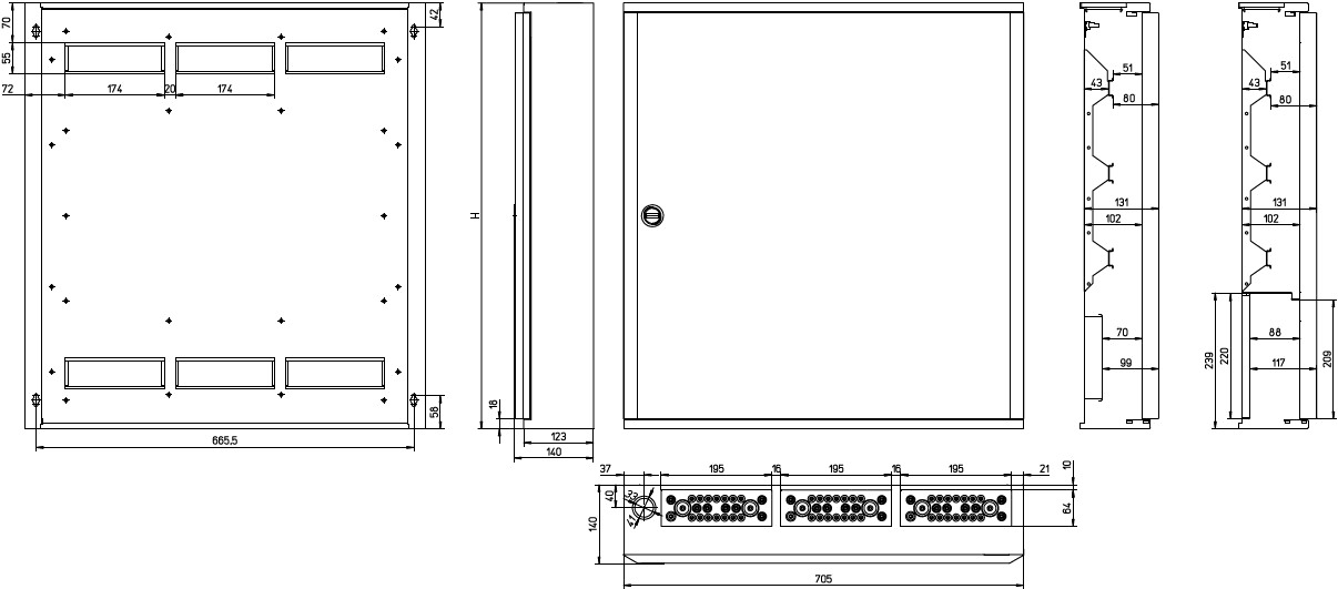 Quadro di distribuzione sottile montato a vista BF-O-./..-C completo, bianco RAL 9016, 33 moduli per fila, 6 file, altezza 1050mm, larghezza 705 mm, profondità 140 mm, inclusa porta, piastre frontali, telaio portante guida DIN e morsetti di neutro/PE Custodia: design chiuso, compresa piastra posteriore, la piastra posteriore può essere usata come piano di fissaggio, aperture ingresso cavi pre-forate sul fondo, terminali pre-montati su custodia (nessuna perdita di unità di spazio). Reggicavo a parete con telaio porta, la piastra posteriore può essere utilizzata come piano di fissaggio, aperture di ingresso cavi facili da sfondare, profondità 127 mm, terminali pre-montati su custodia (nessuna perdita di unità di spazio)
