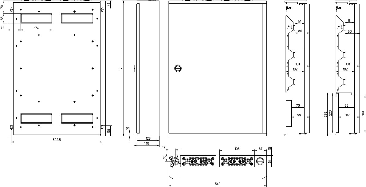 Quadro di distribuzione sottile montato a vista BF-O-./..-C completo, bianco RAL 9016, 24 unità di spazio per fila, 3 file, altezza 600 mm, larghezza 543 mm, profondità 140 mm, inclusa porta, piastre frontali, telaio portante guida DIN e morsetti di parallelo. Custodia: design chiuso, compresa piastra posteriore, la piastra posteriore può essere usata come piano di fissaggio, inserti per piastra passacavi a 2 cavi per quadri di distribuzione sottili con larghezza di 24 unità di spazio, in alto, aperture ingresso cavi pre-forate sul fondo, terminali pre-montati su custodia (nessuna perdita di unità di spazio). Reggicavo a parete con telaio porta, la piastra posteriore può essere utilizzata come piano di fissaggio, aperture di ingresso cavi facili da sfondare