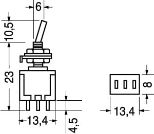 DEVIATORE 1 SC. 3 POS. CON AUTOR. PORTATA:6 A - 125 V. CORPO:materiale fenolico. LEVA:ottone nichelato. TERMINALI:a saldare. DADO RICAMB.:4/15210. CAPPUCCI PVC:4/6560. Pos.Lat.: Instabile, Instabile.