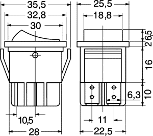 Interruttore bipolare • Corpo in abs nero • Contatti in ottone • Fissaggio al pannello: autobloccante • Terminale: faston passo 6,35