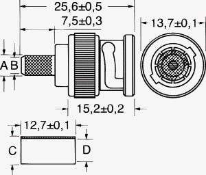 SPINE BNC A CRIMPARE PROFESSIONALI. CORPO:ottone nichelato. ISOLAM.:delrin. PER PRESE:5/22010. GUIDA CAVO:5/20950. CAVO:6/2500. PINZA A CRIMP.:7/1876. Dim. A: 5,4mm. Dim. B: 3,9mm.