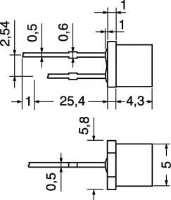 LED PIATTI A FASCIO DIFFUSO Ø 5 mm. MAX POT.:100 mW. TEMP. LAV.:-40°C ÷ +80°C. Colore: Verde.