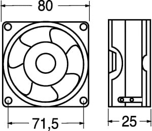 VENTILATORE ASSIALE SUPPORTO CUSCINETTI 80x80x25 mm. ELICA:poliestere termopl. TEMP. LAV.:-20°C÷+80°C. FATT. RUMORE:32 dB. GIRI MIN./RPM:3200. CFM:34. GRIGLIA:45/9650. Per computer, strumenti, ali-mentatori, amplificatori, tele-visori, videogiochi, videoregi-stratori, ricetrasmittenti. Tensione: 12V.