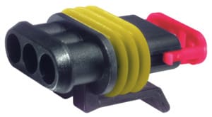 CONNETTORI PORTAFEMMINE AMP SERIE SUPER SEAL 1.5. Intercambiabili e interconnettibili con gli attuali componenti e con gli apparecchi già in uso nel settore automobilistico (sensori, controllo temperatura acqua, ecc.). Resistenti all'immersione statica edinamica in accordo alla norme IEC 529 e DIN 40050 I.P. 6.7. Resistenti a ozono,idrocarburi aromatici, sali, liquido freni, liquido anticongelante ecc. BLOCCH.:poliammide 6,6. caricato vetro approvato UL. AGGANCIO SECONDARIO:poliammide 6,6 caricato vetro approvato UL. GUARN.:gomma siliconica. TEMP.:-40°C÷+125°C. RESIST. ISOL.:200 MOHM. CONTATTI:serie 98/16308. CONNETTORI:98/15995. ESTRATTORE:98/46408. TAPPO CAVITA’:98/16341. CAPPUCCI:serie 98/16245. N.Poli: 4.