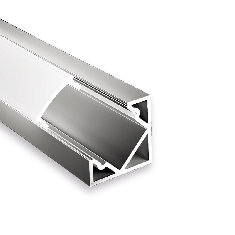 Profili corner in lega di alluminio estruso anodizzato, cover semi-trasparente, ideali per l'installazione di strip led. 4 ganci di fissaggio e 4 tappi di chiusura (2 + 2), sono forniti con il profilo.