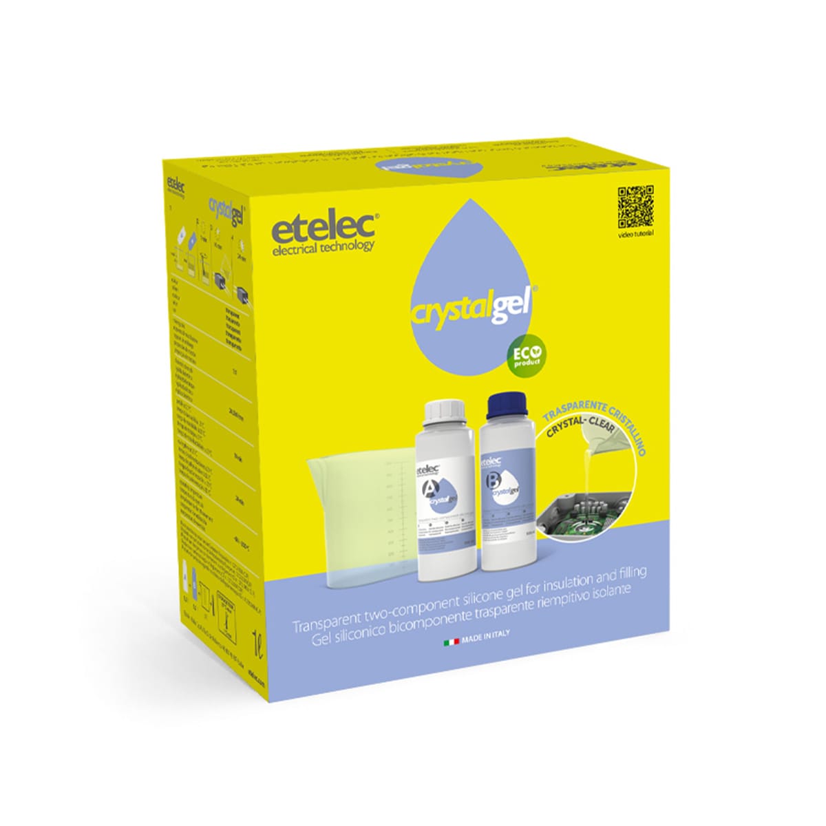 Crystalgel è un gel siliconico bicomponente trasparente e riaccessibile, per riempimenti isolanti e sigillature di scatole e cassette di derivazione contenenti connessioni elettriche fino a 1 kV o componenti elettronici, adatto per le sue caratteristichead una molteplicità di applicazioni. Crystalgel è caratterizzato da una trasparenza elevatissima che consente di mantenere la visibilità del contenuto della cassetta. I due componenti in recipienti separati garantiscono sempre il corretto rapporto di miscelazione 1:1. Crystalgel è fornito con la nuova caraffa graduata da 1 litro che consente di miscelare l’intero contenuto dei flaconi in un’unica operazione, velocizzando ancor di più l’installazione. Crystalgel può essere utilizzato, in base alla necessità, anche parzialmente, e riutilizzato successivamente all’apertura della confezione, massimizzando la resa. Elevata rigidità dielettrica: 24,5 kV/mm. Ampio campo di temperatura di impiego: da -60 a 200 oC. Una volta reticolato, Crystalgel può essere facilmente rimosso, senza l’utilizzo di utensili, anche dopo lunghi periodi di tempo. La bassa viscosità consente di colare facilmente Crystalgel e garantisce inoltre un veloce e sicuro riempimento dei contenitori e degli interspazi. Crystalgel è non tossico, non irritante, privo di odori e senza solventi, ed è classificato come prodotto non pericoloso ai sensi del Regolamento Europeo n. 1272/2008 (CLP). Idoneo per riempimento di cassette di derivazione; isolamento di connessioni elettriche 0,6/1 kV; isolamento di schede e componenti elettronici. Trasparente cristallino. Non tossico. Riaccessibile. Ecologico. Facilmente colabile. Nessuno spreco grazie ai flaconi separati e alla caraffa graduata. Ottimo isolamento elettrico. Protezione dagli agenti atmosferici (pioggia, umidità , polvere) e dall’intrusione di animali, insetti, foglie. Buona resistenza meccanica. Senza scadenza. Riutilizzabile dopo l’apertura.