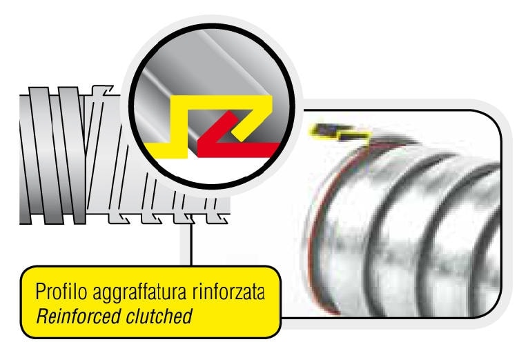 Guaina tipo DMT: molto indicata su impianti ove sia prevista la presenza di scintillii e scorie incandescenti (fonderie, laminatoi, saldatrici, stamperie, ecc.). Ha una buona resistenza meccanica alla trazione, alla torsione, alla compressione. Tubo flessibile in acciaio zincato a caldo ad aggraffatura rinforzata e ricoperto prima di PVC grigio di sottile spessore aspirato sull’anima metallica e poi con trecciatura in acciaio zincato. “Certificato e sottoposto al periodico controllo del marchio di qualità IMQ”. Buona resistenza agli olii, all'invecchiamento e agli acidi generalmente usati nelle industrie. Non propagante la fi amma secondo le norme CEI EN 61386.