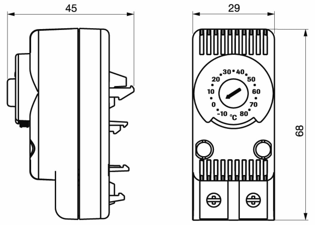 Termostato bimetallico impiegato per il controllo della temperatura nei quadri elettrici. Il contatto cambia stato all'aumentare della temperatura. Adatto per comandare apparecchi di ventilazione, riscaldamento e segnalatori di allarme. Montaggio a scatto su guida TS35, TS15, TS32. Custorida in PA66 autoestinguente secondo UL 94V-0- Colore standard grigio RAL7035. Terminali a vite.