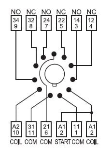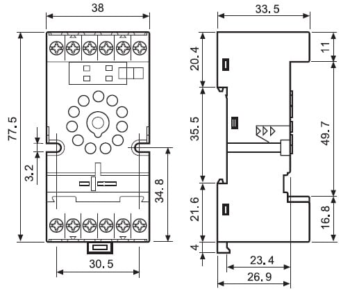 Zoccolo con mersetti a bussola. (A): 10 Grado di protezione: IP 20 Accessori: Moduli di segnalazione e protezione EMC;pettine 6 poli;moduli temporizzatori;ponticello metallico