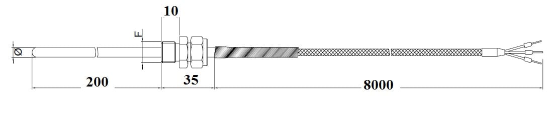 termoresist. materie plastiche: Mod.: TR1 (singolo elemento) modello: con raccordo a compresione scorrevole elemento + numero fili:Singolo 4 fili classe precisione:Pt100 classe B (1 DIN) Cavo (Standard a norma DIN):GSC (0,35 mm) Materiale guaina: AcciaioInox Diametro guaina (mm): 6 filettatura raccordo:G 1\8 Materiale raccordo: ottone nichelato lunghezza cavo (dm):80 dm tipo di connettore:nessun connettore armatura:nessuna guaina lunghezza immersione Li (mm): 200 mm certificati: nessuno