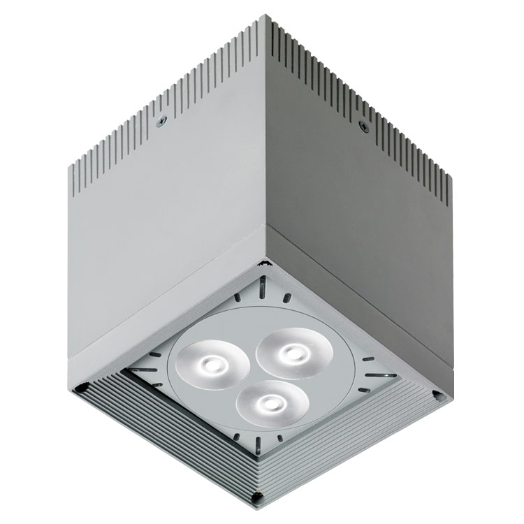 Apparecchio per esterni per installazione a soffitto. Corpo lampada, basetta e cornice fermavetro in alluminio primario anticorrosione a basso tenore di rame. Diffusore in vetro temprato trasparente. Sorgente luminosa a Led, CRI 80. 23,5W. 2800 lm. 38°. 3000K. Colore Bianco