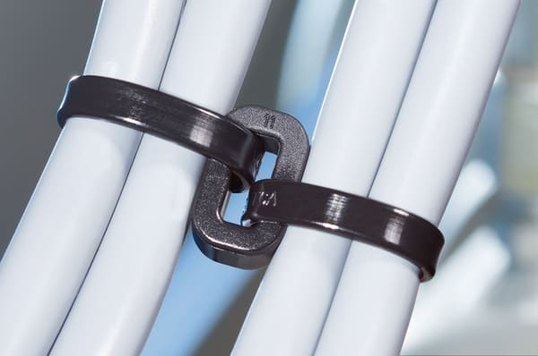LOK04 per far correre in parallelo più fasci. Può essere utilizzato con fascette di larghezza massima 9 mm. L'elemento di giunzione LOK04 è la soluzione ideale dove ci sia la necessità di far correre in parallelo due o più fasci.