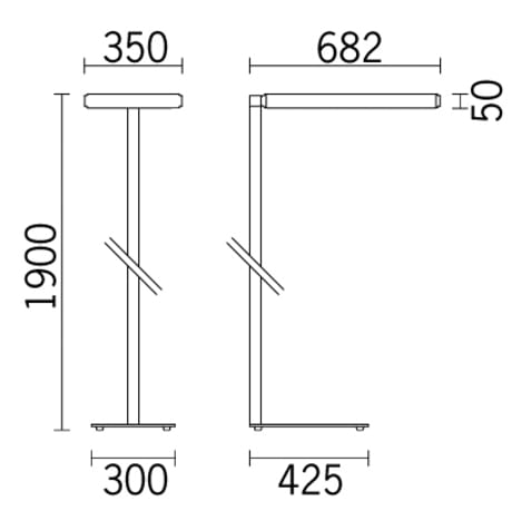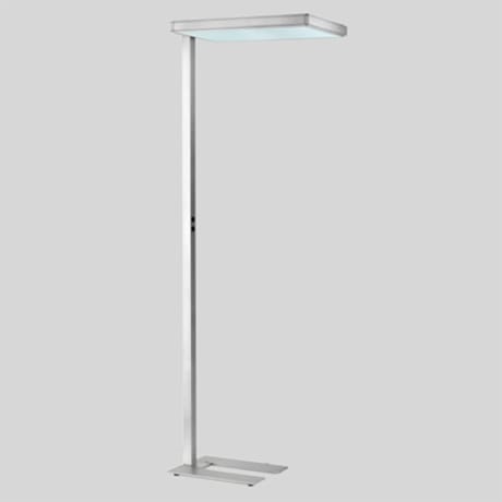 Apparecchio da terra ad emissione diretta/indiretta finalizzato all’impiego di sorgente LED neutral white 4000 K. Ripartizione del flusso luminoso 34% down light, 66% uplight. Vano ottico con profili laterali in alluminio estruso e verniciato, testate dichiusura in pressofusione di alluminio. Gruppo ottico costituito da riflettori in alluminio superpuro. Lo schermo diffusore, realizzato in policarbonato, è dotato di microprismature e, abbinato ad un film opalino diffondente, consente un’ottimale diffusione della componente diretta della luce e un controllo della luminanza L<1.500 cd/m2 per α≥65°.Apparecchio idoneo all'utilizzo in ambienti con video terminali secondo la norma EN 12464-1. Il vano ottico è supportato da un’asta realizzata in alluminio estruso a sezione quadrata. La base, a forchetta, è realizzata in acciaio ed è dotata di gommini anti-scivolo. L’assemblaggio asta-base è facilitato grazie alla presenza di connettori ad innesto rapido.