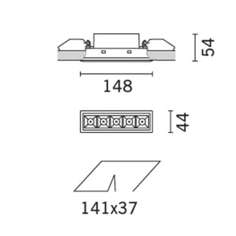 Apparecchio miniaturizzato ad incasso rettangolare a 5 elementi ottici con sorgenti LED - ottiche fisse - apertura flood. Corpo principale con superficie radiante in alluminio pressofuso, versione con cornice perimetrale di battuta. Ottiche ad alta definizione in termoplastico metallizzato, integrate in posizione arretrata nello schermo antiabbagliamento nero; la composizione strutturale del sistema ottico evita l’effetto puntiforme, permette di ottenere una distribuzione luminosa definita e circolare e determina un'emissione ad abbagliamento controllato (UGR < 19). Fornito con gruppo di alimentazione elettronico collegato all’apparecchio. LED bianco neutral. LED 10W 920lm. Neutral 4000K CRI 95. Gruppo Elettronico incluso. Ottica: WF - Wide Flood 48°. Orientabilità: Fisso. Materiale: alluminio pressofuso. Dimensioni (mm): 148x44x54, Peso (kg): 0,29. Colore: Bianco.