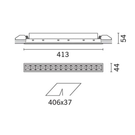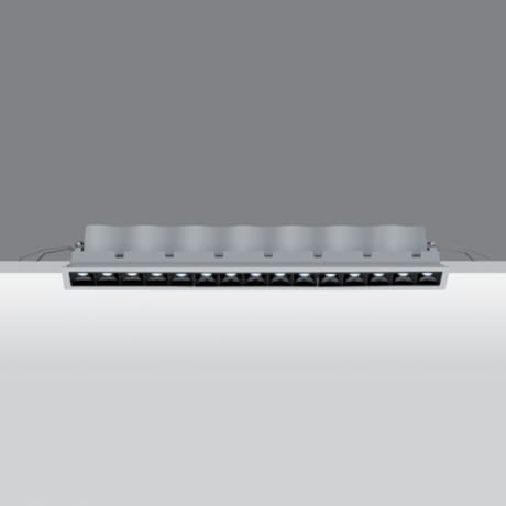 Apparecchio miniaturizzato ad incasso rettangolare a 15 elementi ottici con sorgenti LED - ottiche fisse - apertura spot. Corpo principale con superficie radiante in alluminio pressofuso, versione con cornice perimetrale di battuta. Ottiche ad alta definizione in termoplastico metallizzato, integrate in posizione arretrata nello schermo antiabbagliamento nero; la composizione strutturale del sistema ottico evita l’effetto puntiforme, permette di ottenere una distribuzione luminosa definita e circolare e determina un'emissione ad abbagliamento controllato (UGR < 19). Fornito con gruppo di alimentazione elettronico dimmerabile DALI collegato all’apparecchio. LED bianco warm. Colore: Bianco / Nero (47). LED 31W 2760lm. Warm 3000K CRI 90. Gruppo ElettronicoDALI dimmerabile incluso. Ottica: S - Spot 12°. Orientabilità: Fisso. Materiale: alluminio pressofuso. Dimensioni (mm): 413x44x54, Peso (kg): 0,86.